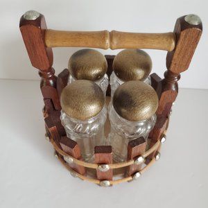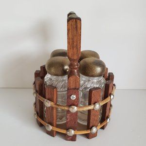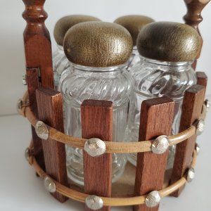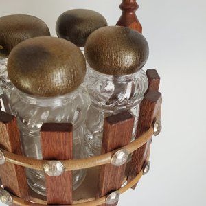 Wood basket with silver accents * 4 glass spice bottles w/ wood lids