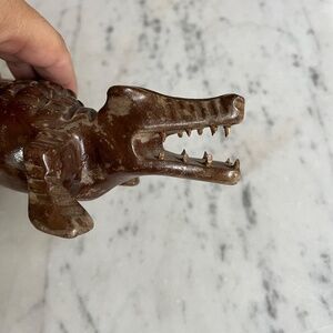 Vintage wood carved crocodile / alligator ashtray. Awesome retro bar piece. Shows wear to finish, missing a teeth (adding that much more character). See photos for details. No indication of maker. Measures approx. 9.75" x 4.5" x 2".