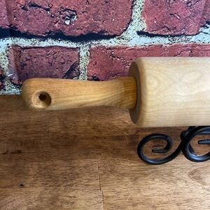 Vintage Wood Rolling Pin in working condition. This one is lovely. It’s a little larger with large handles. It may need refinishing oil before use on food. It’s perfect for home decor piece. A few signs of wear and age. See pics.