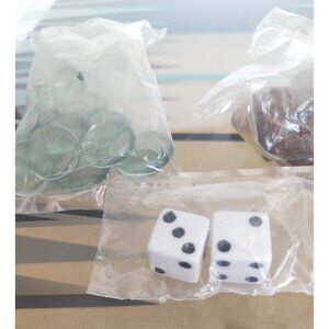 Wooden board is in perfect condition, all pieces and dice are in unsealed bags, there is tiny chip on the glass overlay see last photo
