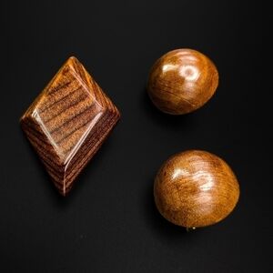 vintage, wood, wooden, diamond shaped, bezel edge, grain, woodgrain, brown, texture, unique, design, wearable art, round, button, clip on, earrings, set, geometric, shapes, brooch, pin, c-clasp, gold toned metal, natural, nature, trees