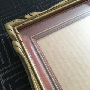 Very good preowned vintage condition gold-brushed, wooden frame with mahogany beveling and cornice shadow box frame. I'm not sure how old this piece is, but I'm guessing it's old as it's extremely well made. Has an distinct Victorian flair. Some of the hardware may have been replaced (plastic tabs to secure the back piece). They could be replaced with metal tabs, but it might shred the wood over time. There are a few tiny nicks here and there, but nothing too noticeable. This frame is gorgeous, but alas, I have too many. A rare gem. If interested, I can include a personal print or two.
