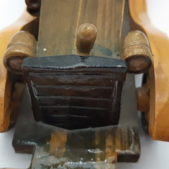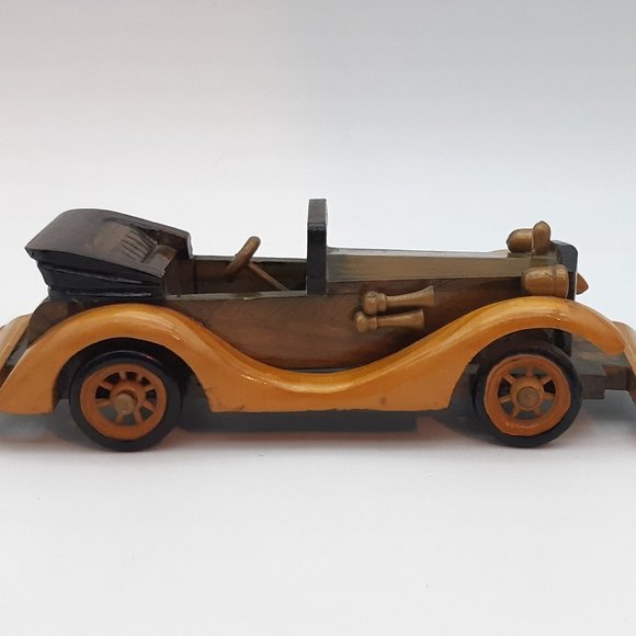 This is a vintage wooden model car, I don't know the model. It is light and dark brown and has tires made of plastic. There are some nicks, please consult the pictures.