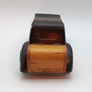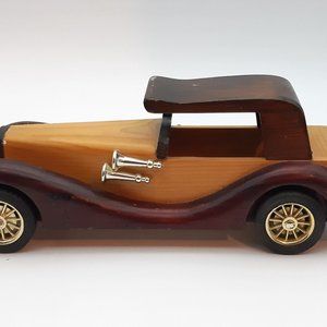 This is a vintage wooden model car, I don't know the model. It is light and dark brown and has tires made of plastic. There are some nicks, please consult the pictures.
