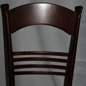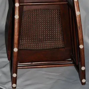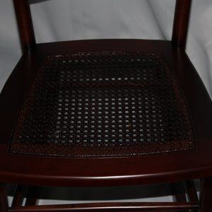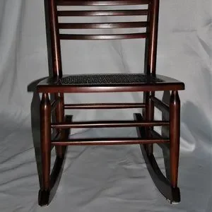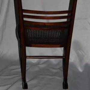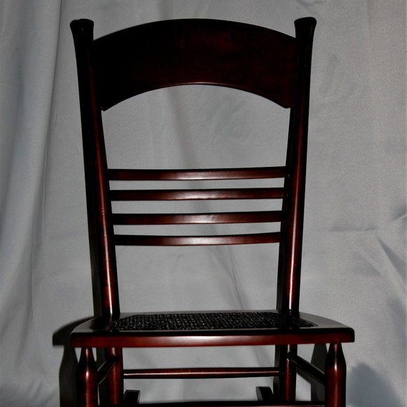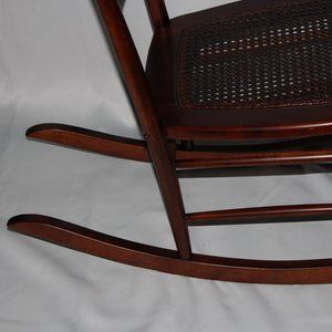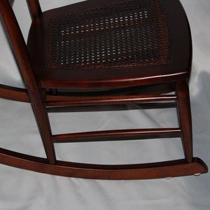 This vintage wooden rocking chair has retained its deep, rich stain. The cane seat is in very good condition, as is the entire chair with only minor nicks on the sides. It sits low so is better suited for persons 5'9" and under.