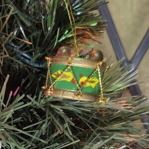Vintage set of 2 ornaments to hang on your Christmas tree or use as part of your Christmas decorations. These two hand-painted wooden toys depict a green drum and a train. Perfect for a nostalgic and kitshy touch!