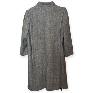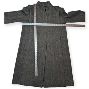 Beautiful long style, wool, silky interior, black accent button, pleated style detail, herringbone - wear fitted or oversized.
