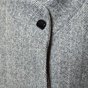 Beautiful long style, wool, silky interior, black accent button, pleated style detail, herringbone - wear fitted or oversized.