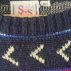 #vintagesweater #woolblend #90sfashion #apresskistyle #geometricknit #navysweater #retroknit #vintagewinter