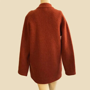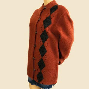 Gorgeous burnt orange colour cardigan jacket accented with charcoal rhomboid shapes. Maid with boiled wool fabric.