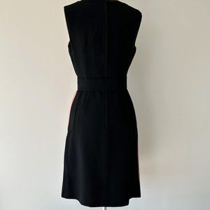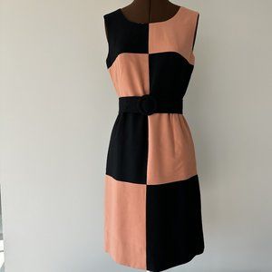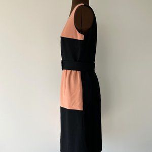 Elegant, lined midi sleeveless dress with coral and black color blocking front, single coloured back, back zipper closure and belt.
