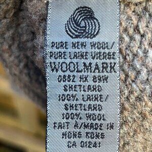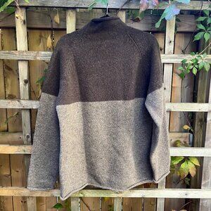 This vintage colourblock turtleneck sweater from Simons features soft, neutral tones of deep brown and heather taupe, knit from 100% Shetland Wool. The relaxed silhouette and cozy turtleneck make it perfect for cool-weather layering and slow weekends.