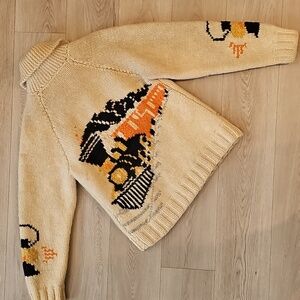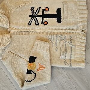 Condition: the wool is dirty, it will need to get washed / dry cleaned. as pictured there are areas which are worse for staining than others. the under seam on the left arm, there is a hole. has wool wear, as wool wears with the surface being fuzzy. no pilling. the left side of the bottom of the zipper has separated slightly from the jacket. as this is a handmade item, there may be deficiencies in the knitting.