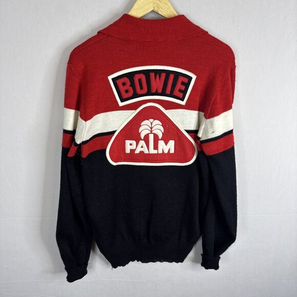 Authentic vintage Canadian wool curling sweater by Clover Brand / Maple Knitting Mills, made in Edmonton, Canada. Classic zip-front curling jacket with bold BOWIE name patch across the back and large PALM sponsor logo. Traditional red, white, and navy striped design typical of mid-century curling and club sweaters. Heavy knit wool construction with ribbed cuffs and hem, pointed collar, and full zipper. Strong Canadian sports heritage piece.