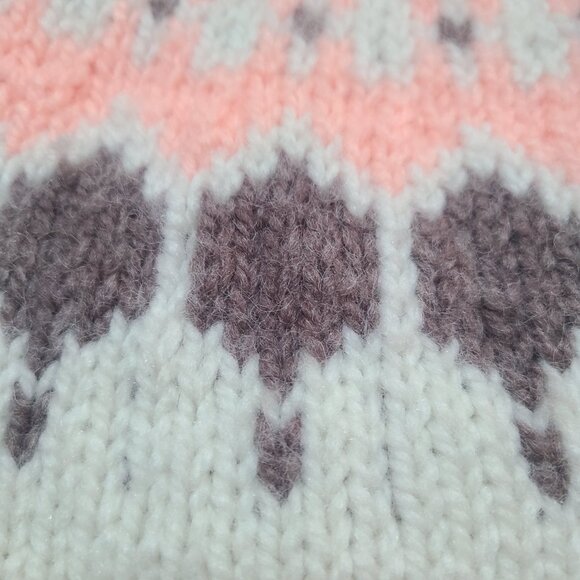 Beige handknit sweater with peach and brown detailing.