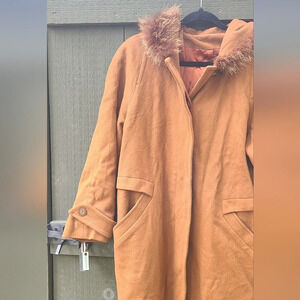 Fabulous camel coloured vintage wool maxi jacket with fur trimmed hood.