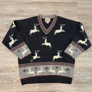 Vintage Woolrich Deer/Stag Cabincore Alpine Charcoal Grey Wool Patterned Cozy VNeck Sweater