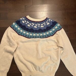 Beautiful vintage Woolrich Woman sweater featuring a classic Fair Isle/Nordic yoke design with sheep motif throughout.