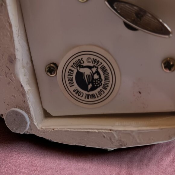 Add a touch of romance and nostalgia to your home with this beautiful vintage 1997 Forever Yours Innovation Gift Ware Corp. wind-up music box. Expertly hand-painted in resin, it features two white doves perched closely together on a branch, surrounded by lush grapevine leaves and clusters. The doves’ tender expressions capture a feeling of love and devotion, making this an ideal piece for collectors, bird lovers, or as a heartfelt gift.