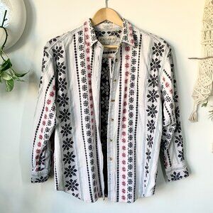 Vintage Woven Boho Stripe Pattern Button Up Collar Shirt Top Granola Grandmacore