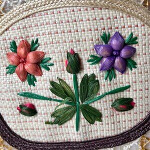 This lacy woven vintage raffia bag was made in Taiwan, likely in the late 1970s or early 1980s. It has a wood notch-loop closure, an inner metal zippered pouch, and a front pocket. It is in beautiful condition. Part of one green raffia leaf on the front is sticking up a bit. It measures nearly 12 inches long and about 7.5 inches from the top of the fabric handle to the purse opening. This bag is partially see-through due to the lacy materials and woven fabric used in its construction.