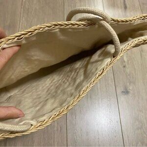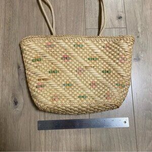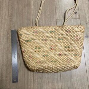 Vintage woven basket style shoulder bag. Doubles straps with wooden bead. Lined.