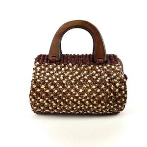 Vintage Woven Top Handle Medium Sized Handbag • Straw and Natural Fibers • Wood