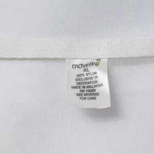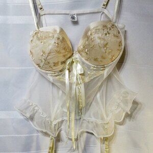 For the bride! A vintage bustier with garters by Enchanting. Silky soft sheer nylon with embroidered underwire padded cups (that will accommodate forms), and a lace-up at the front to easily accommodate various sizes. Adjustable garter straps for your thigh highs. Excellent vintage condition. It's tagged XL and measures up to 21 inches underarm to underarm, with some flexibility provided by the lace-up front. Note: panties not included.