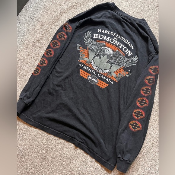 2007 HD long sleeve t shirt size large. Measures 22” pit to pit and 29” top to bottom. In good pre owned condition. Edmonton Alberta chapter.