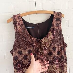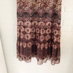 Vintage Y2K 90s midi dress Tiered Boho Burgundy Metallic Mixed print Sz 15