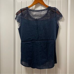 This vintage Y2K Abercrombie blouse exudes romantic charm with its sheer delicate floral lace detailing at the top, complete with a ribbon tie and elegant cap sleeves. Made from a cotton linen blend in dark navy blue, it offers a lightweight and breathable design perfect for various occasions. Its timeless style pairs beautifully with both casual and formal outfits.