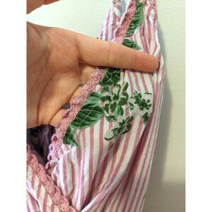 Super adorable romper / jumpsuit vintage from the early 2000s! This romper features a faux wrap front, ruffle hem, elastic waist, spaghetti straps, and tie detail in the back. It has a white and pink striped pattern with florals overlayed. It is in excellent condition!