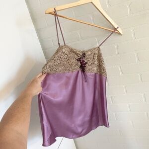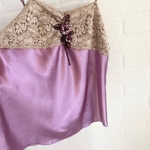 Vintage Y2K Babydoll Tank top Lace Fairy Beaded Flower Mauve Lavender Satin Sz L