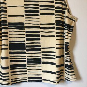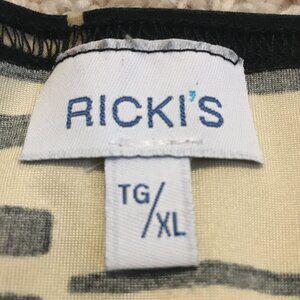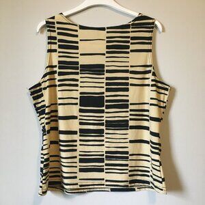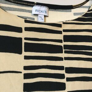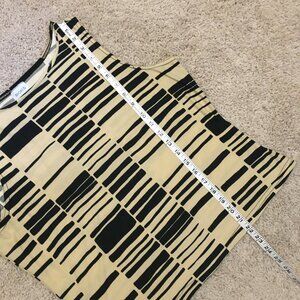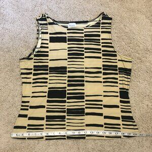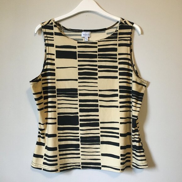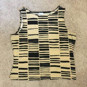 Excellent preowned vintage condition, stretchy, soft fabric, black and creamed honey yellow, tribal pattern/bar code pattern tank top. This is another vintage Ricki's piece, so it was made in Canada some time in either the 90s or early 2000s with great quality control. A nice piece. Feels like cotton, but it's polyester.