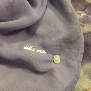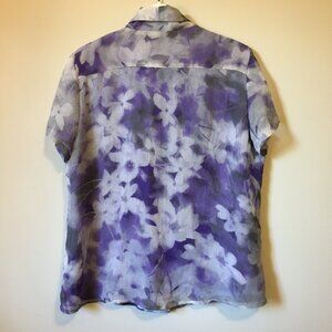 Very good preowned vintage 90s condition, two layer, sheer chiffon, button up short sleeve, pintuck shirt. You can tell this is an authentic 90s piece from the tag, though it has been since cut out. This was a popular style I remember well. Features a cute watercolour floral print in greys, white, and purples. Very sweet.
