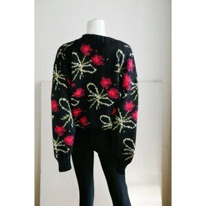 Vintage Y2K Floral Novelty Print Black Pink Cute Statement Pullover S/M