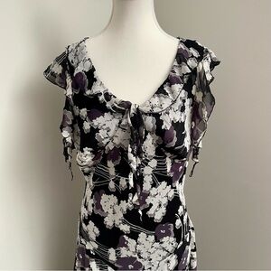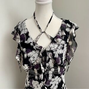 Vintage Y2K Flowy Ruffle Drop Waist Whimsigoth Fairycore Midi Length Dress. Tie string details, can be tied various ways or tucked inside. Black and white floral print. Dropped waist. Flutter sleeves. Size XXXL but vintage sizing, fits more like an XL. Check measurements below to ensure fit. Excellent condition.