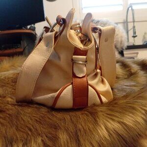 This bag features a main cream color with tan/cognac colored accents (trim, straps). The hardware is prominent and silver-toned, including decorative buckles and rings.