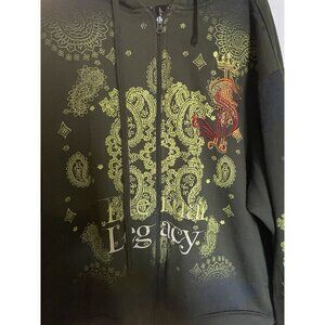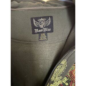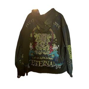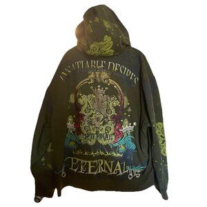 Embrace the unique blend of edgy style and comfort with the Vintage Y2K Insatiable Desires Raw Blue Punk Japanese Anime Dark Green Sweater. This distinct piece showcases a bold graphic print, adding a statement to your casual attire. Its versatile dark green hue is complemented by an array of accents, including jewel, studded rhinestone, zipper, and logo details, making it a standout addition to any wardrobe.