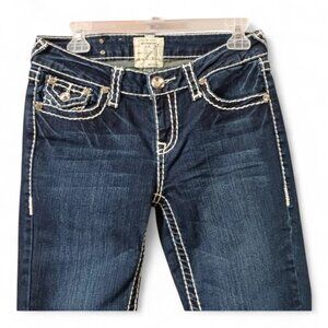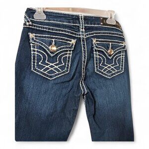 Bring back the sparkle of the 2000s with these vintage LA Idol skinny jeans in dark wash denim. Featuring rhinestone crystal rivets, a large crystal button, back flap pockets with crystal details, and bold contrast stitching, these jeans are pure Y2K glam.