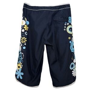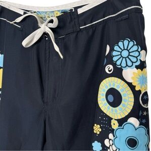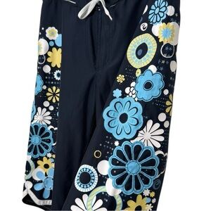 Y2K-era navy board shorts by Powder Room, featuring bold 2000s-style floral graphics in blue, yellow, and white. Long Bermuda-length cut with lace-up front, snap button fly, and a single velcro flap pocket at the back.