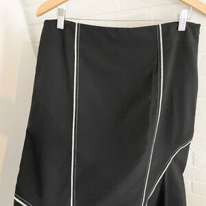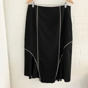 This is gorgeous black midi skirt by the designer jmichaels. It is made of a soft, high quality fabric and features a unique design with contrasting cream stitching and shorter flowy hemlines sides. The skirt has a fitted waist and a flowing, asymmetrical hemline.
