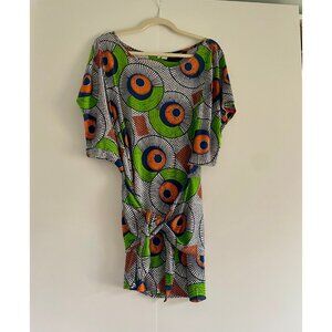 100% silk mini dress by Nieves Lavi. Features an abstract circular mod pattern in green, orange, blue and white. Attached wide belt ties lie at front side.