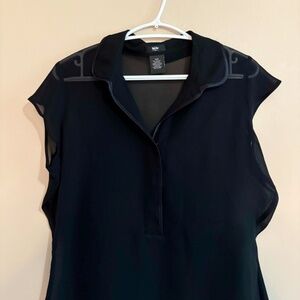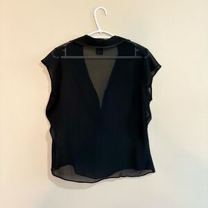 This stunning vintage Y2K Mossimo blouse features a sheer black fabric with sleek satin trim, offering a bold yet elegant look. The deep collar and cap sleeves add a touch of sophistication, making it a perfect addition to any fashion-forward wardrobe.