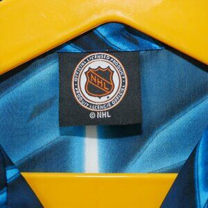All-over print featuring a hockey player in silhouette, and multiple classic team logos. Same print on front and back of shirt. Button closure at front. Slightly oversized fit.