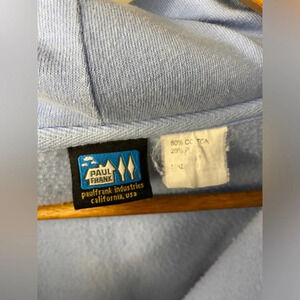 This hoodie is in such amazing shape! So cute. Iconic Paul Frank blue. Sleeves are bit on the short side! Size tag rubbed off but fits like a small. No cracks in logos at all
