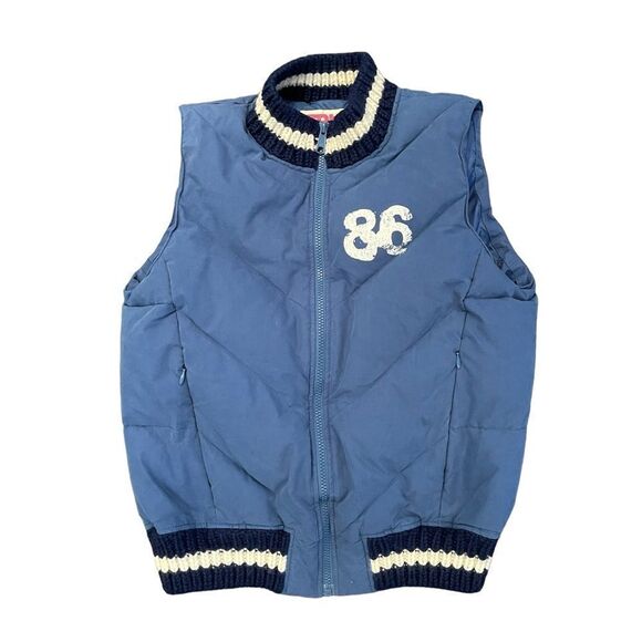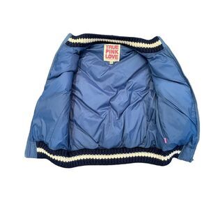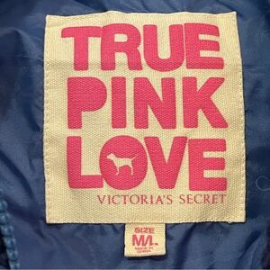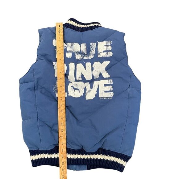 Vintage Y2K Pink Victoria Secret Down Puffer Women's M/L Blue Zip Up Vest Jacket. PINK Victoria's Secret Number 86, "TRUE PINK LOVE" on back, blue with blue and white ribbed neck and waistband, down-filled, zip up puffer vest with 2 zip close pockets. Cotton blend shell. Very good used condition. Please see photos for approximate measurements.