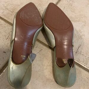 These are VINTAGE shoes with signs of age. Please examine the final photo carefully. The metallic synthetic material covering the heel area and strap has begun to deteriorate/crack. This is a common issue with vintage shoes made with certain non-leather synthetic materials.