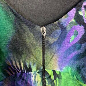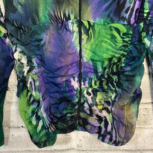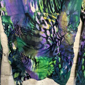 Embrace the nostalgia of the 90s early 2000s with this whimsical VTG Y2K Babydoll Top. The sheer, purple green black ruched mesh fabric offers a delicate and sophisticated look, while the full zip closure, lined upper and long sleeves add practicality and ease of wear. Perfect for a range of occasions, this blouse is versatile enough for casual outings, cocktail parties, travel, or even a touch of whimsy at work. The blouse features a playful mixed Leopard Zebra animal print, a scoop neckline, empire waist and is crafted from a comfortable stretchy polyester-spandex blend. Designed to flatter with a slimming silhouette and lightweight feel, it's an ideal choice for those seeking a blend of retro charm and modern comfort. Whether you're aiming for a gothic vibe, a grunge look, or simply a colourful statement piece, this blouse is machine washable and ready to complement your unique style.