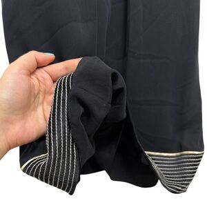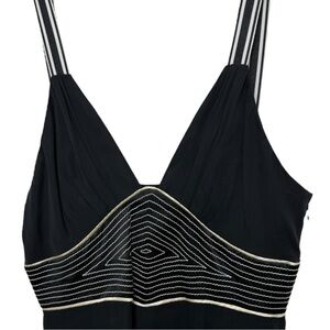 Vintage black and white silk mini dress by Catherine Malandrino. Features an a-line silhouette, v neckline, and embroidered geometric stripe detailing at the waistband and hem. Concealed zip closure at side.